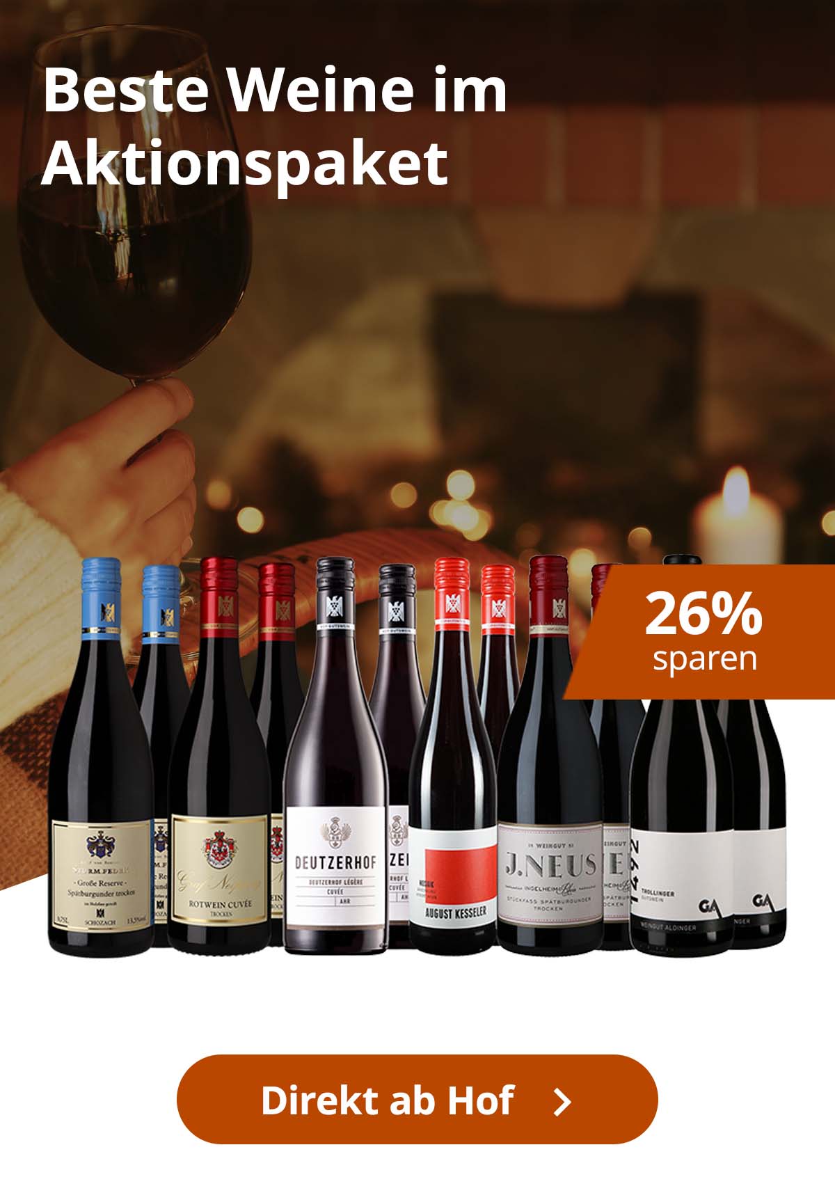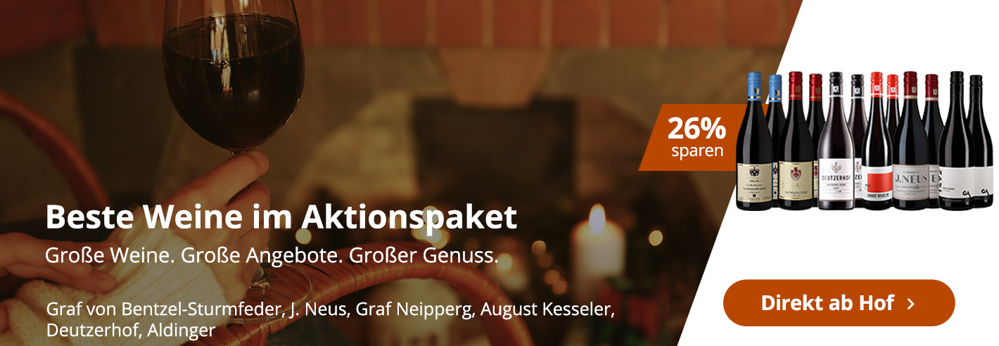 Darüber hinaus bieten wir zudem saisonale und wechselnde Wein Angebote und Wein-Aktionen mit Weinpaketen oder Einzelweinen an. So werden beispielsweise im Winter oder Sommer die jeweiligen besten Pakete dieser Kategorien auf dieser Seite zusammengetragen.