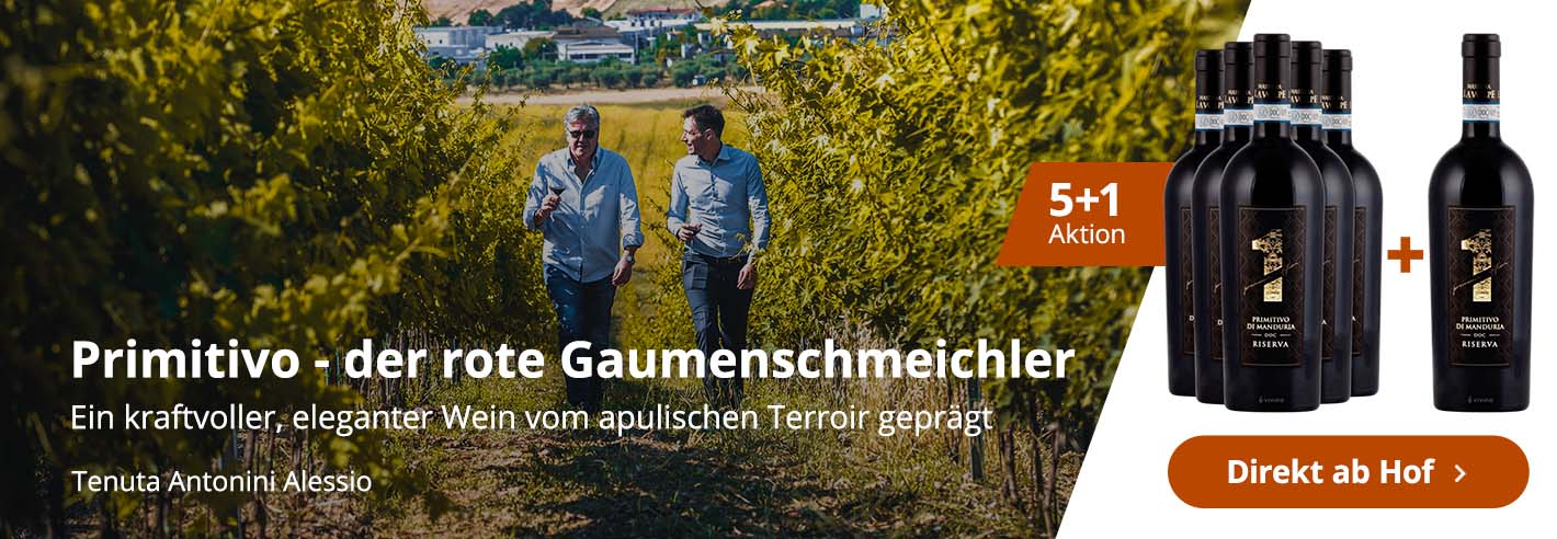 Primitivo ist ein tiefroter, fruchtiger Rotwein, der vermutlich aus Kroatien stammt. Sein Hauptanbaugebiet ist Apulien, der 'Stiefelabsatz' Italiens. Hier reifen die Trauben für diesen alkoholreichen, dunklen Wein, der durch seine Aromenvielfalt besticht.