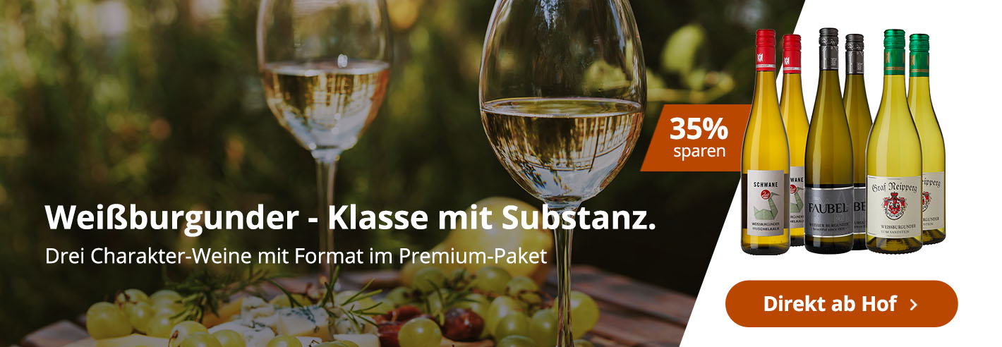 Nektarine, Aprikose, Mandarine, helle Blüten, Orangenschale, Apfel, getrocknete Kräuter. Mit mittlerer Struktur am Gaumen, recht und damit korrespondierende Fruchtsüße, feine Würze, neben Apri...Nahe9,50 € 12,67 €/L (0,75 L) - Weißburgunder Premium-Paket - WirWinzer Select35% sparenWirWinzer SelectWeißburgunder Premium-Paket