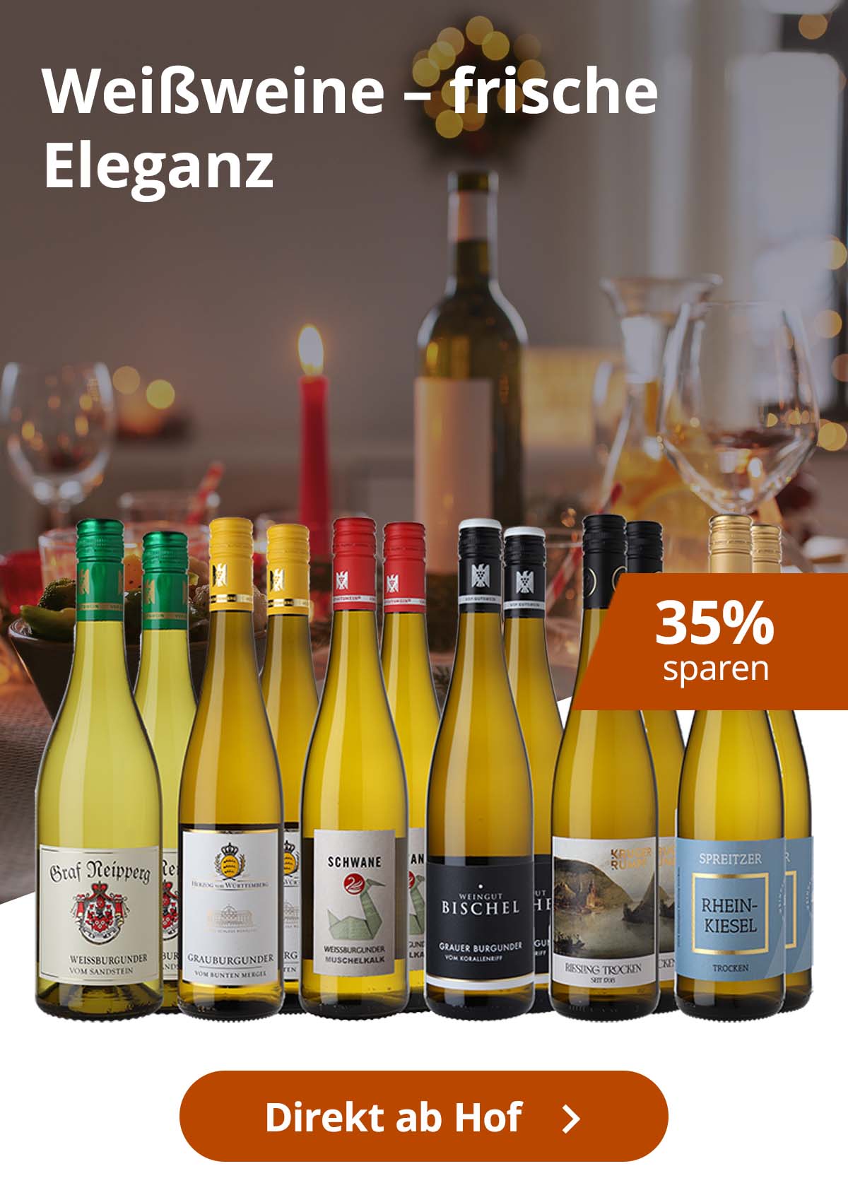 Neben diesen bekannten Weißweinsorten gibt es viele weitere Weißweine für Genussmomente. Müller-Thurgau, Gewürztraminer, Gutedel, Silvaner, Auxerrois oder der gelbe Muskateller überzeugen ebenfalls durch die vielschichtigen Aromen. Unser Tipp: Kaufen Sie ein Weinpaket, um neue Weine von erfahrenen Winzernzu probieren und neue Lieblingsweine zu entdecken.