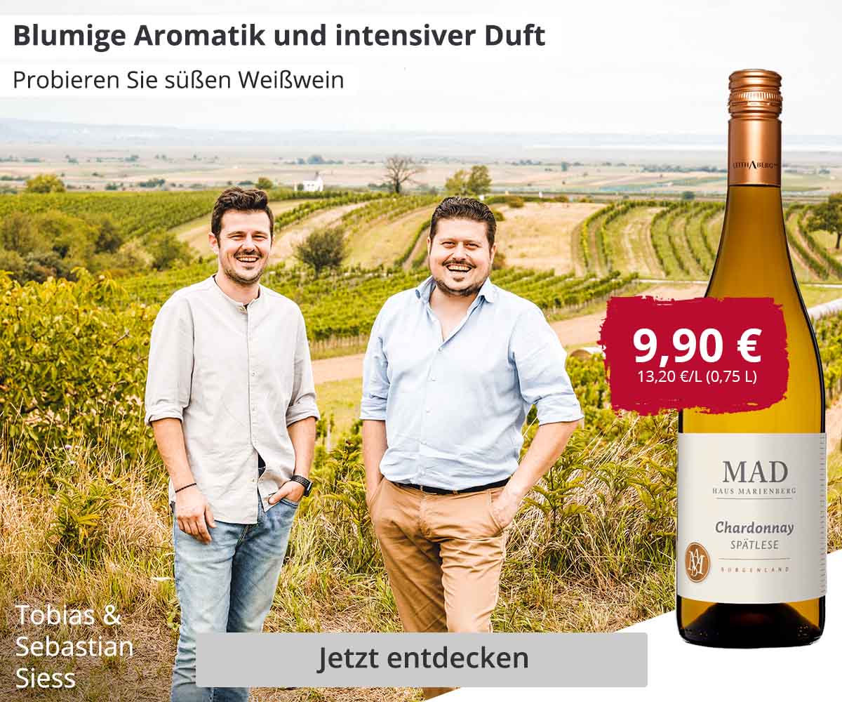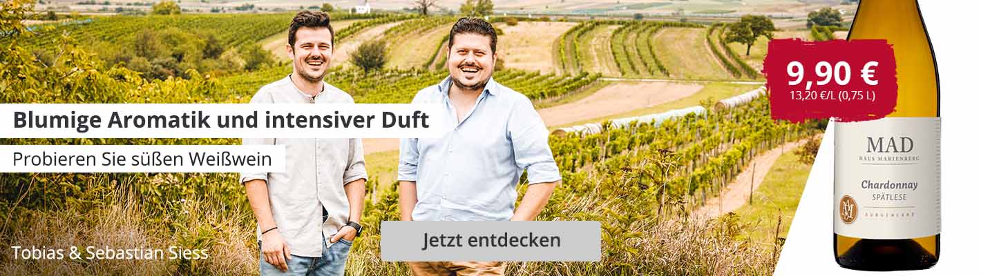 Die Vielfalt ist groß und es lohnt sich, in die Welt von süßem Weißwein einzutauchen. Die ausgeprägte Restsüße trifft im Mosel-Riesling auf eine überzeugende Säurestruktur - der richtige Wein für den unkomplizierten Genuss. Würzig-süß mit betörendem Rosenduft ist ein Gewürztraminer aus der Pfalz der perfekte Begleiter zum gereiften Blauschimmel- oder Ziegenkäse. Weich und cremig kommt eine aromatisch-komplexe Scheurebe aus Baden daher, ein süßer Kerner schmeckt als Aperitif. Mit Mango-Maracuja-Aromen und zarter Muskatnote begleitet ein Muscaris optimal würzige asiatische Speisen. Durch den niedrigen Alkoholgehalt wird die Schärfe nicht unnötig verstärkt.