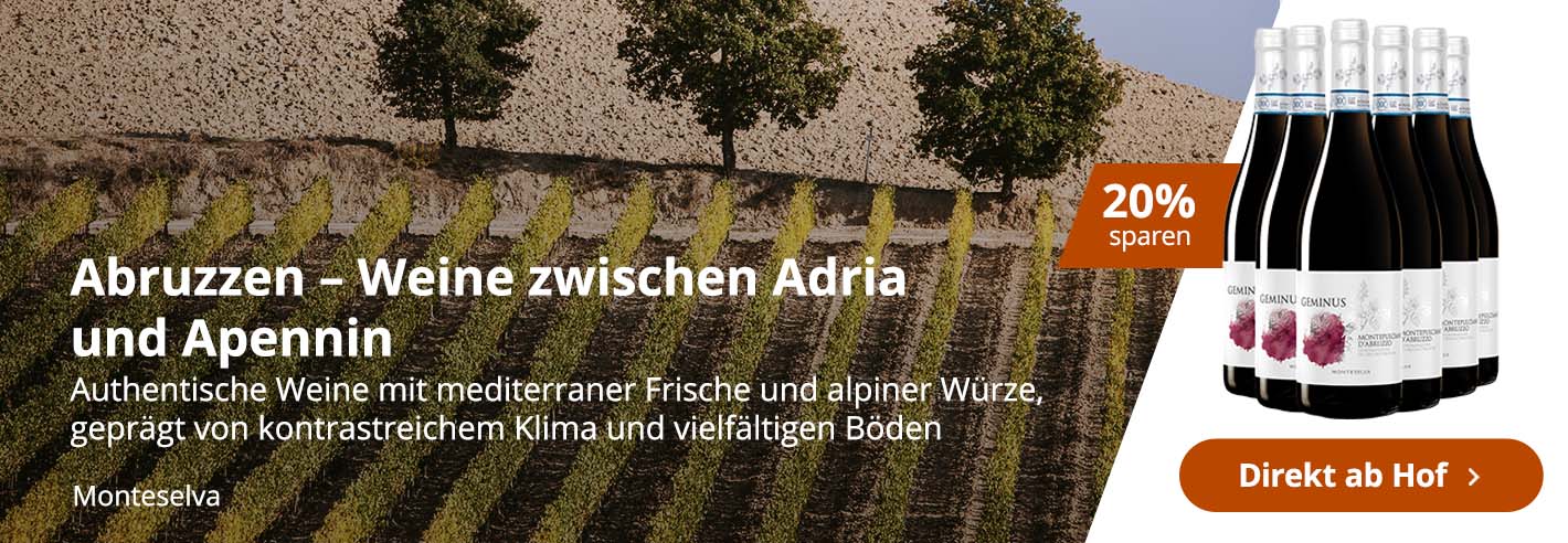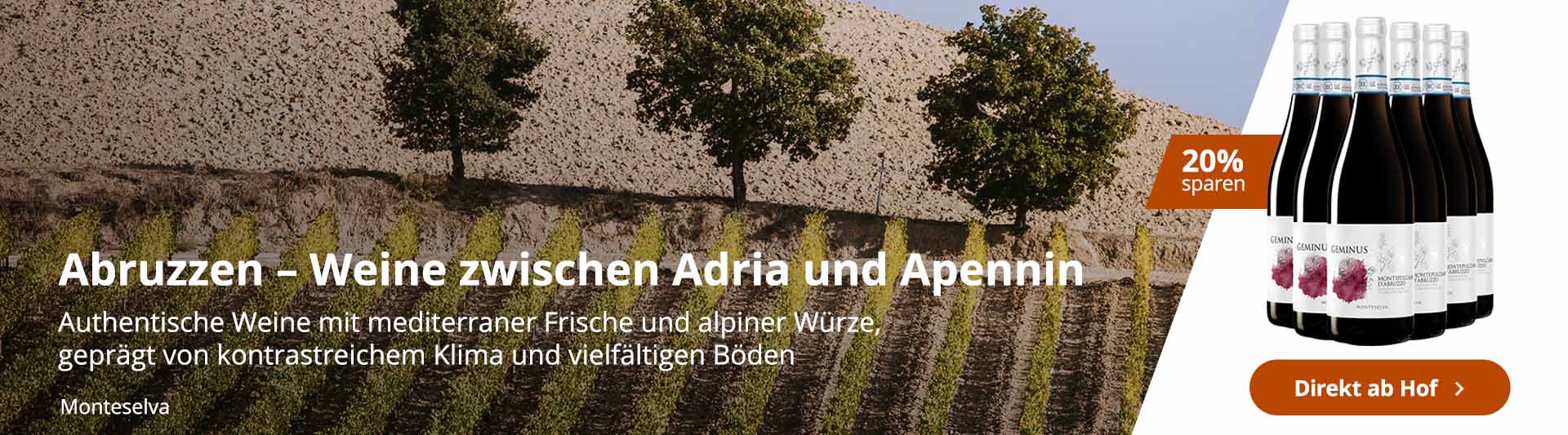 Die Abruzzen sind eine Region, welche östlich von Rom liegt. Von der Sonne verwöhnt und von den Gewässern gekühlt, entstehen hier Weine mit besonderer Qualität und charakteristischer Aromatik. Die Adria begrenzt im Osten diese Region, es folgt eine sanft ansteigende Hügellandschaft, die schließlich ins Gebirgsmassiv Gran Sasso d'Italia führt. So vereinigt die Region der Abruzzen im Kleinen die drei großen geographischen Gebiete Italiens: Küste, Hügellandschaft und Berge. Ein großer Teil des Gebiets steht unter Naturschutz, was auch für die wunderbare Vegetation und die Einzigartigkeit dieses Landstrichs spricht. Wer hier Urlaub macht, kann herrliche Wanderungen unternehmen oder auch die vielen architektonischen Kleinode genießen, wie etwa San Clemente al Vomano in der Gemeinde Notaresco, eine ganz besondere Kirche.