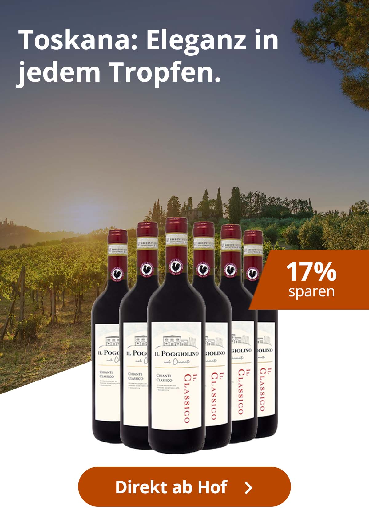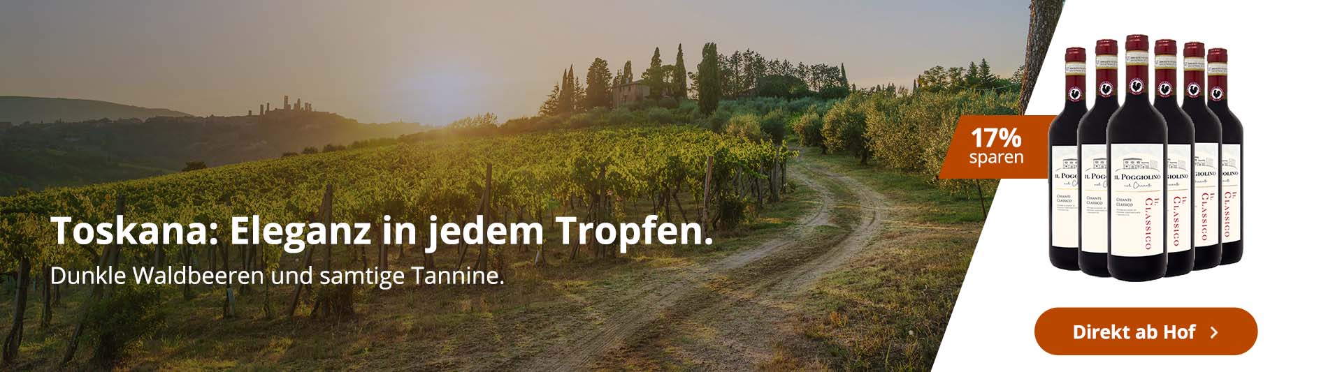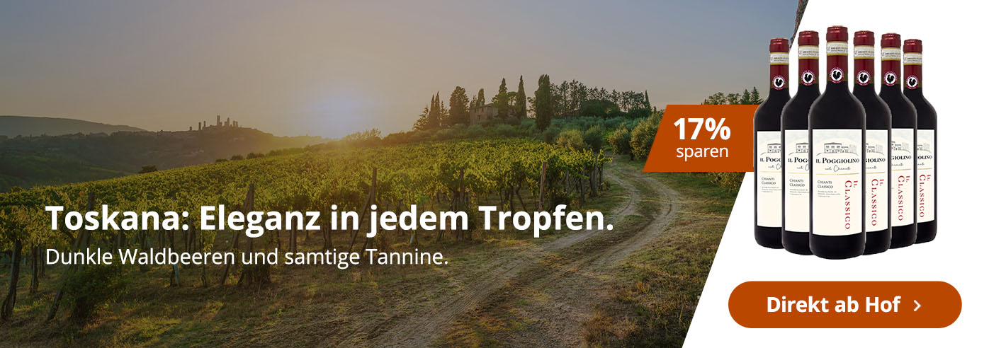 Egal ob Weißwein aus der Toskana, Rotwein aus der Toskana oder Rosé aus der Toskana. Wir haben eine große Auswahl an verschiedensten Toskana Weinen. Vom großen Winzer bis zum Familien Weingut aus der Toskana ist alles mit dabei. Wenn Sie bei WirWinzer einen Toskanischen Wein kaufen, bekommen Sie diesen direkt vom Weingut zu ihnen vor die Haustür geliefert. Dank unserem Vielfältigen Sortiment an Weinen aus der Toskana können Sie hier auch echte Toskanische Wein Geheimtipps entdecken und kleine Familienbetriebe unterstützen. Wenn Sie also Toskana Wein kaufen möchten, dann ist WirWinzer genau der richtige Onlineshop für Sie.